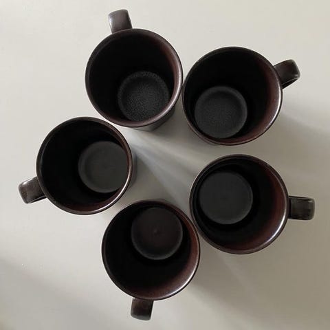 Svarta träfat medföljer att använda som underlägg/ fat eller ovanpå muggen för varmhållning av kaffet.