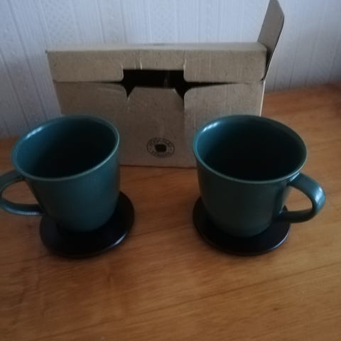 2st fina muggar i Höganäs vackra grönblå glasyr som brukar benämnas verona eller smaragdgrön. Mått ca 8cm höga och 8cm i diameter.