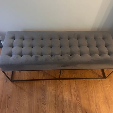 Sittbänk med sammetstyg. Mörk olivgrön. Inga fläckar, hushåll utan djur. Skön att sitta på. Köpt för 2295kr år 2020.