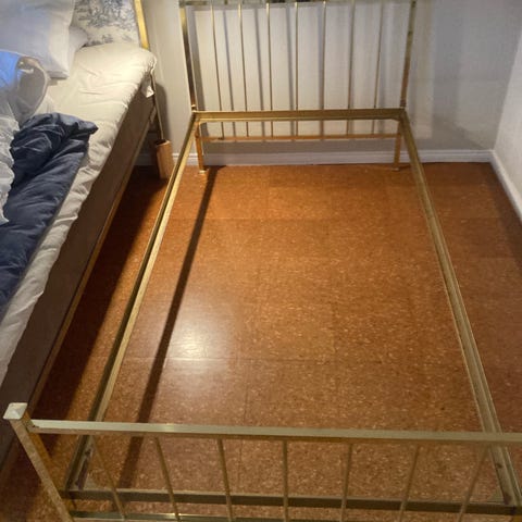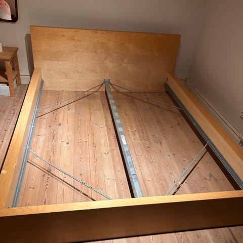 Sängram, höjd i huvudändan 960 mm, fotändan 750 mm. Längd 2030 mm, bredfd 1630 mm. Vi har 2 x 80 x 200 Ikea madrasser, ingår ej.