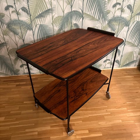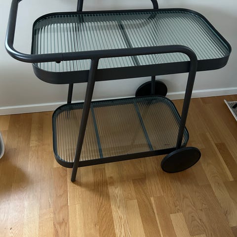 Blombord eller serveringsvagn med hjul. I rostfri metall höjd 80 cm. Djup 42 cm, bredd 52 cm.