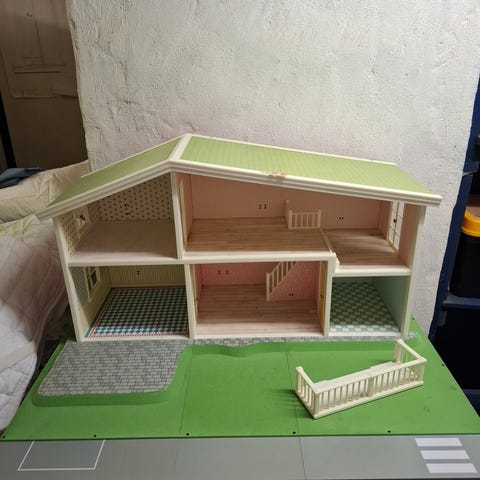 Det här är ett dubbelgarage (kan användas som stall) med altan som är byggt till Lundby dockskåp. Mycket fint gjort och lekvänligt.