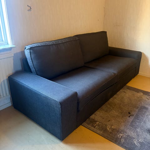 Säljer en grå soffa med ekben. 210cm lång och 85cm bred.