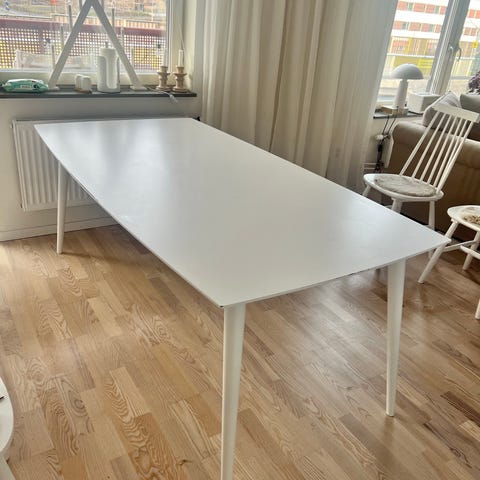 Ovalt matbord, vit, 160x100 cm, med ekben. Bordet är i gott skick men ett litet hack i skivan. Bordet är nedmonterat.