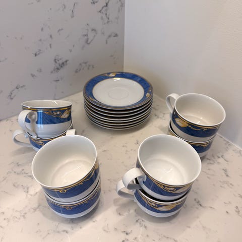 Servisen inkluderar tallrikar, koppar, kanna, sockerskål och serveringsfat med det klassiska blåvita mönstret. Materialet är porslin med reliefmönster och dekorativa fåglar. Passar för dukning och servering.