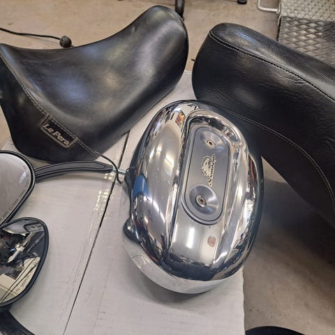 Bdl beltkit 90-93 Softail endast provmonterad passar nyare med 9kugg jackshaft 10500:- Beg jackshaft 9 kugg 500:- SnS B förgasare 1600:- S&S insug 700:- Hd Org rakekrona 2600:- lampa ny 4,5" 400:- Billet 5 3/4 600:- Oljefilter håll nytt 500:- org risers 600:- Mc fälg 15" 1000:- Bromsskivor 300/st SnS 631 evo kam ny 600:- D ringar panna krom nya 500:- Kan skicka mot betalning av frakt!