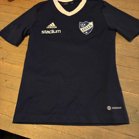 Adidas blå fotbollströja i barnstorlek med korta ärmar och tryckta logotyper. St ca 8 år. Svart stadium tröja med text MAI. St 134/140. Adidas tunn övedragsjacka med 2 fickor. Tunnt nätfoder. St ca 8 år