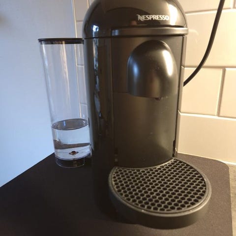 En glasburk för Nespresso-kapslar, köpt separat från Nespresso, ingår i köpet.