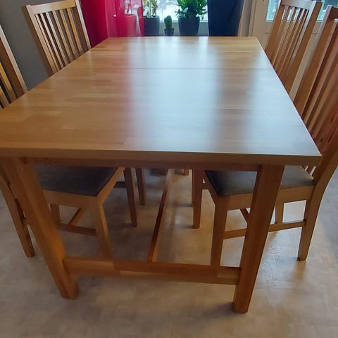 Smart utfällbart köksbord där iläggsskivan fälls ut underifrån! 170cm utfällt och 130cm ihopfällt. Rejält rundade hörn så det har en oval känsla.