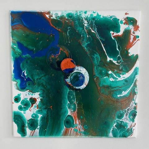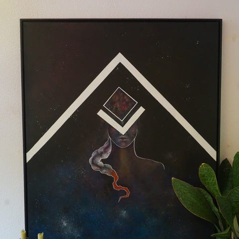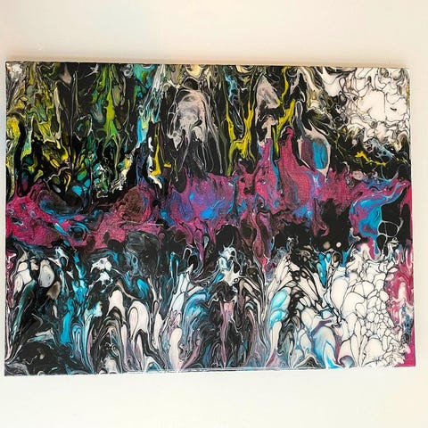 Färgglad abstrakt akryltavla som visar ansikten och djur i olika färger och former. Tavlan har en dekorativ målad ram, med hörn i guldfärg.