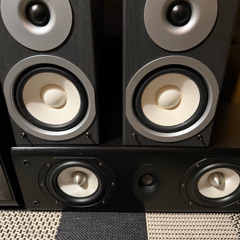 Funkar men är gammalt och har diverse småproblem, därav bortskänkes. På front- och centerhögtalarna är att ett klåfingrigt barn tryckt in metallen enligt bild 5, men oklart vilka konsekvenser det haft (barnet är numer 15 år och de har använts i bra många år sedan dess). Projektorn surrar en del och kan behöva en ny lampa. På fjärrkontrollerna funkar vissa knappar dåligt och batteriluckorna är tejpade.