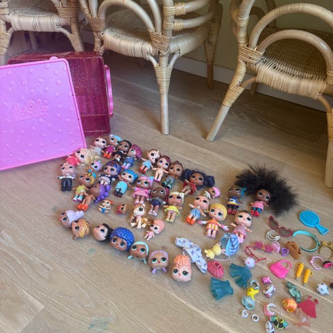 L.O.L. dockhus med flera rum och inredning, inklusive dockor och fordon. Setet innehåller ett hus med möbler och en husbil. Låda med mindre tillbehör och mindre dockor. 6st stora dockor. Skickas ej.
