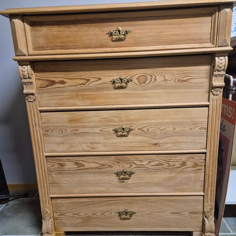 Träskåp i furu med två dörrar och två lådor. Skåpet har hyllplan inuti för förvaring. Materialet är trä med naturliga knutar och en varm träfärg. Passar för allmän förvaring i hemmet. Trasig list på framsidan, se foto.