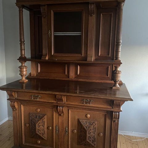 Antikt skåp i vitt med två dörrar och två lådor. Skåpet har detaljerade snidade pelare på sidorna och metallhandtag på både dörrar och lådor. Passar för förvaring i olika rum.