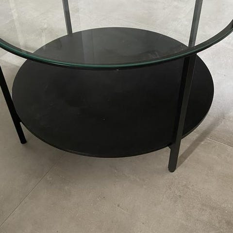 Svart satsbord med glasskiva. Är 92cm lång när det är ihopdraget.