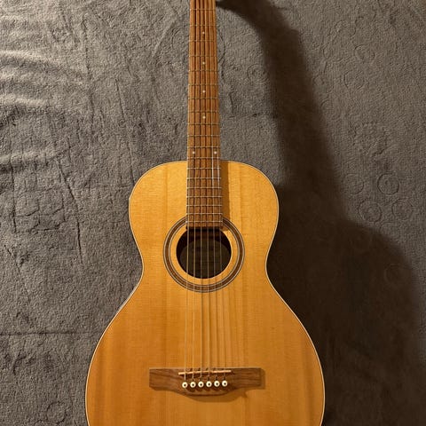 Akustisk westerngitarr med liten och slank kropp, solitt granlock, sidor och botten av rosewood och natohals med greppbräda av rosewood.