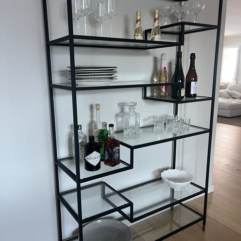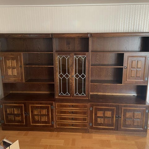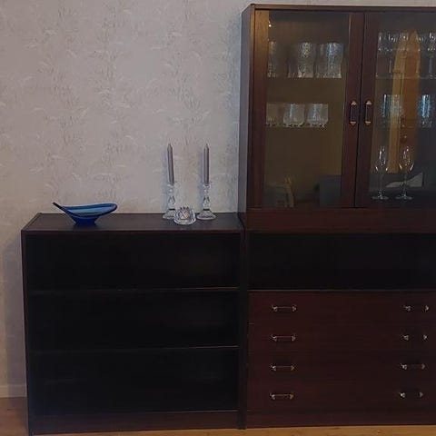Bokhylla i Mahogny. Belysning i vitrinskåpen.Tv upp till 49 tum får plats
