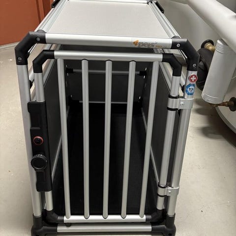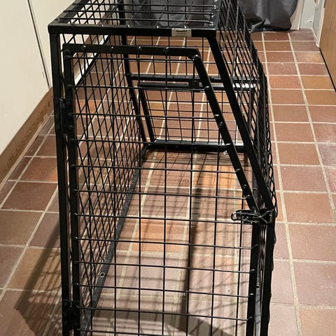 Hundbur för bil i bra skick säljes. Ungefär 50x75x66 cm (BxDxH).