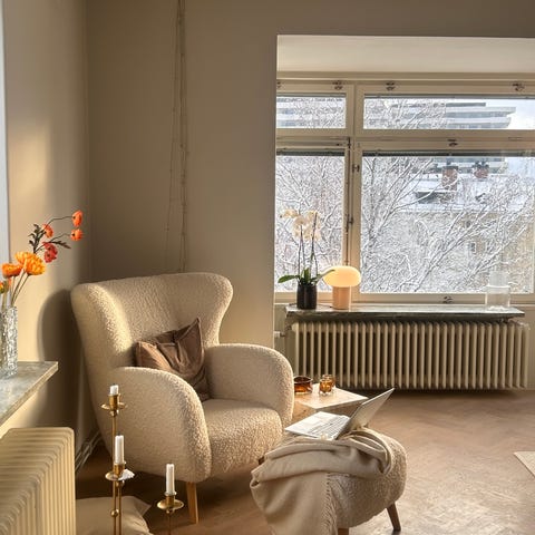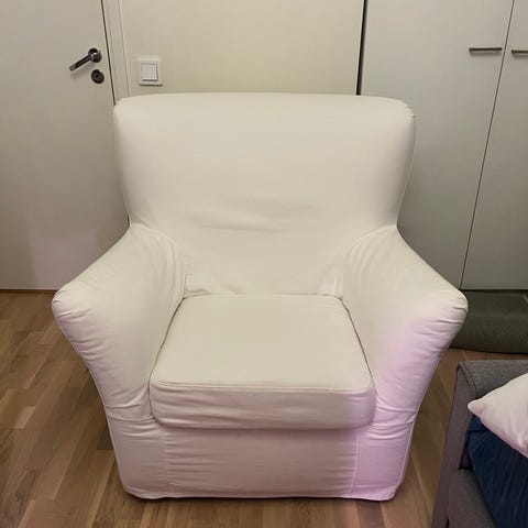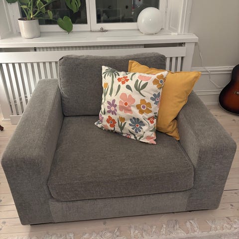 Fåtöljen med överdrag finns att hämta i Gamla Enskede