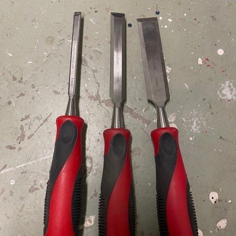Set med tre verktyg bestående av två filer och en rasp. Handtagen är av plast i olika färger: rött, svart och orange. Verktygen är avsedda för bearbetning av material genom slipning och formning.