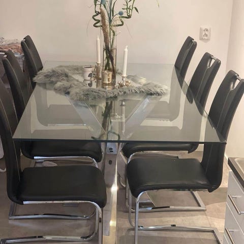 Fint mat bord med silverben . Finns 2 inläggs skivor på 50*100 cm. Bordet passar allt från 6-12 personer.
