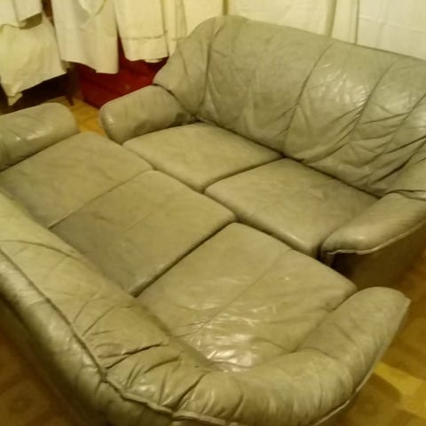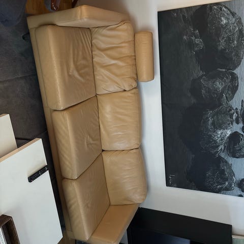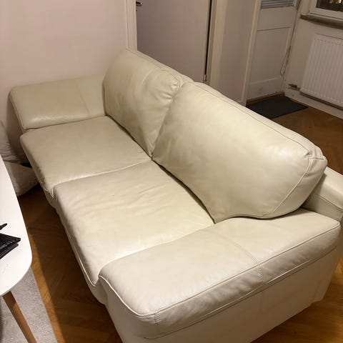 Svart lädersoffa från Mio som använts i 10 år skänkes mot upphämtning. Ca 2,5 meter i bredd. I använt skick men skön att sitta på! OBS har en del veck där lädret försvunnit och slitage.