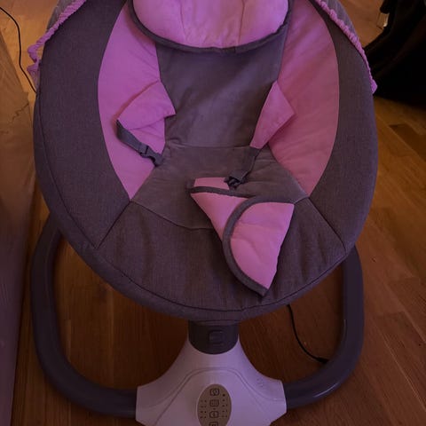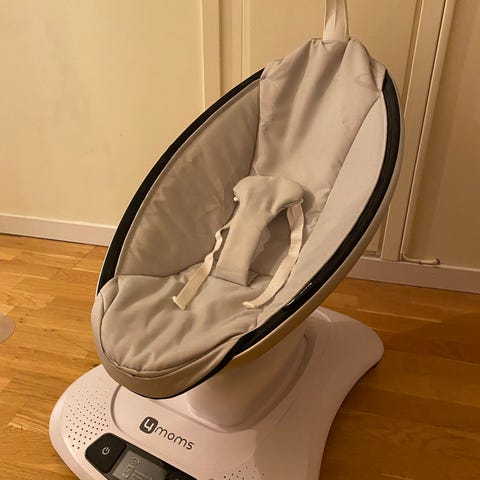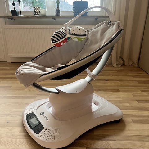 4moms barnstol i grå och vit färg med mjuk vaddering och säkerhetsbälte. Passar för små barn och kan användas för vila eller lek. Stolens design inkluderar en leksaksmobil för stimulans.