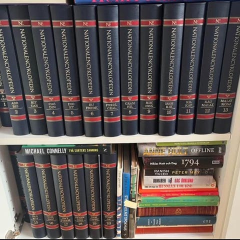 UGGLEUPPLAGAN så vacker som INREDNINGSDETALJ. Nordisk familjebok uppslagsverk komplett i 38 band, inklusive komplementband, från 1910/20-tal, halvfranskt band i rött läder med GULDPRÄGLAT tryck. Uppslagsverket är bland Sveriges mest komplette uppslagsverk med hela 182 000 uppslagsord. Skåp och skulptur är rekvisita.