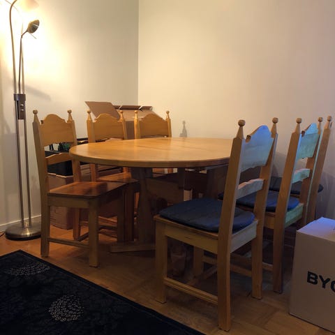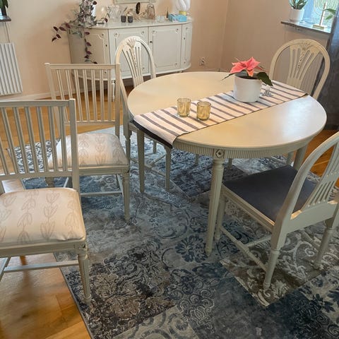 Axet matbord och 6 stolar med beige klädsel.