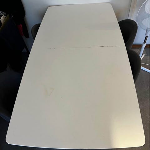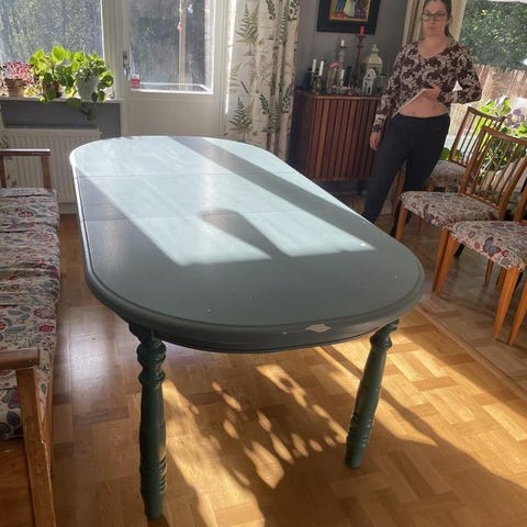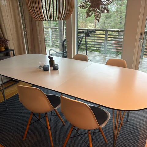 Säljer vårt matbord då vi köpt ett annat. Väldigt praktiskt med iläggsskiva som förvaras under bordsskivan.