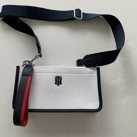 Tommy Hilfiger axelväska i tyg för unisex. Väskan har flera fack med dragkedjor och en design med Tommy Hilfigers karakteristiska färgdetaljer. Passar för dagligt bruk och för att bära personliga tillhörigheter på ett praktiskt sätt.