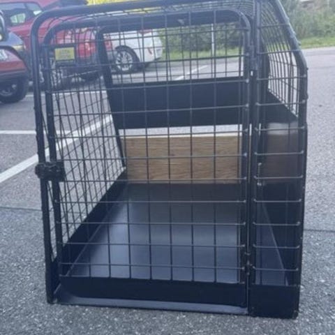 Hundbur i metall med dubbla fack och gallerdörrar, avsedd för transport i bil. Burens design möjliggör säker och separerad plats för två hundar under bilresor.