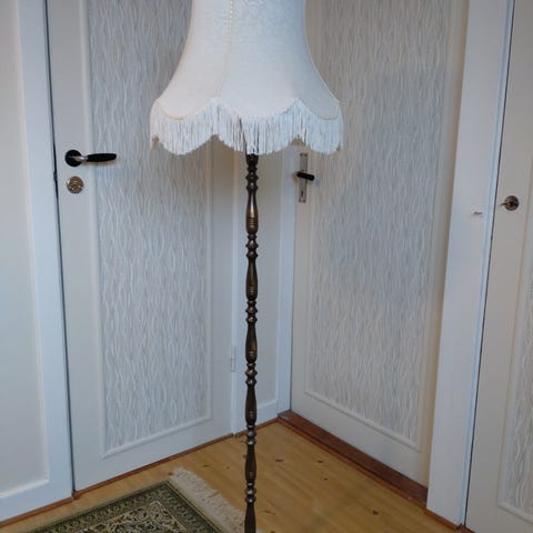 ”Armaturbolaget Malmö Nr 48” golvlampa med rosa skärm och gulddetaljer.