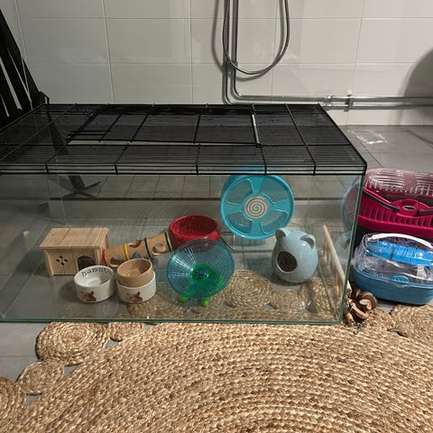 Obs! Hållaren till vattenflaska samt hjulet har lite skador. Buren är tejpad på ena sidan och det sitter fast lite bottenströ mellan plankan och glaset som går att få bort om man skruvar isär buren. Skriv för flera bilder.