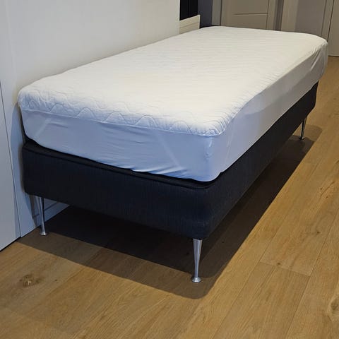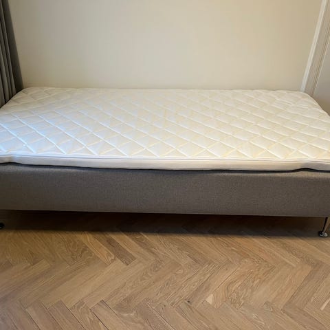 Mio säng med stoppat huvudgavel i grå klädsel. Sängen har en enkel och modern design med fyrkantiga metallben. Passar för enkelrum eller mindre sovrum. Nypris 5000 kr