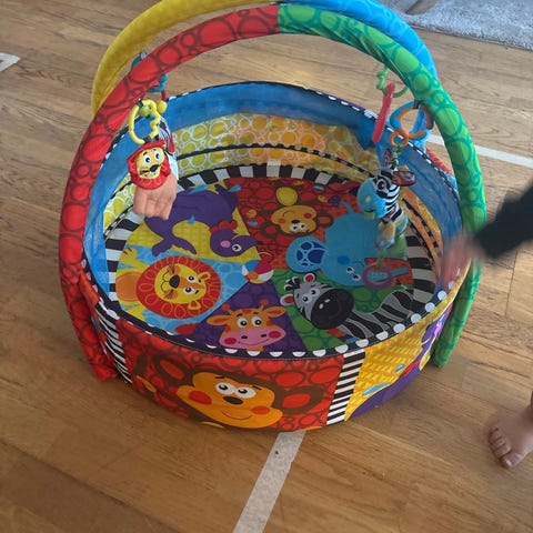 Fisher-Price lekmatta med hängande mjuka leksaker och en ljusfunktion i en av leksakerna. Mattan har färgglada motiv av djur och regnbågar, och en båge med flera hängande leksaker för barnets stimulans och lek. Passar för små barn och spädbarn.