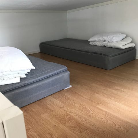 Säng 90 cm bred och 200 cm lång. Har använts som säng till barn. 2 par ben medföljer. 4 raka enkla ben och 2 bågformade ben som går över bredden i varje ände. Bäddmadrassen ingår.