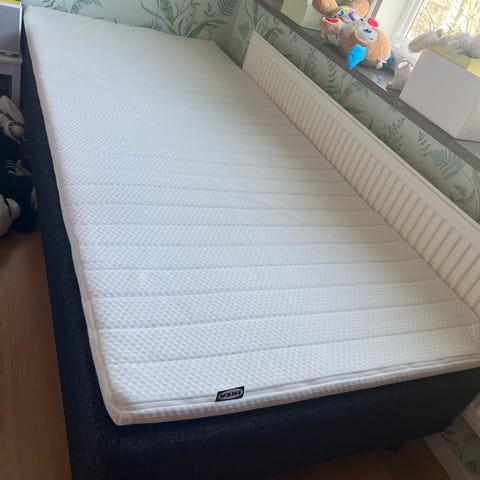 Säng 90 cm bred och 200 cm lång. Har använts som säng till barn. 2 par ben medföljer. 4 raka enkla ben och 2 bågformade ben som går över bredden i varje ände. Bäddmadrassen ingår. Säljes för 500 kr.