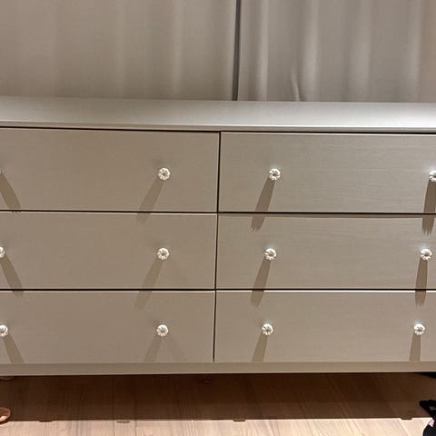 Byrå vitlaserad furu. Praktisk och bra med förvaringsutrymmen i både skåp och lådor. Hyllplanen är reglerbara. Fint skick. Mått 84 cm hög kan justeras till 81 cm, 131 cm lång och 39 cm djup.