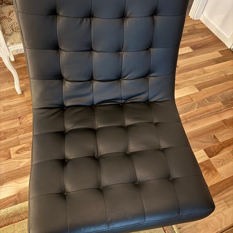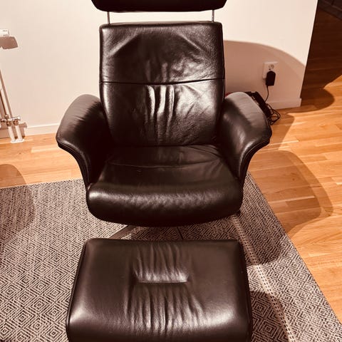 En Timeout fåtölj i svart läder från MIO med tillhörande fotpall i bra skick sparsamt använt säljes för 12000kr.