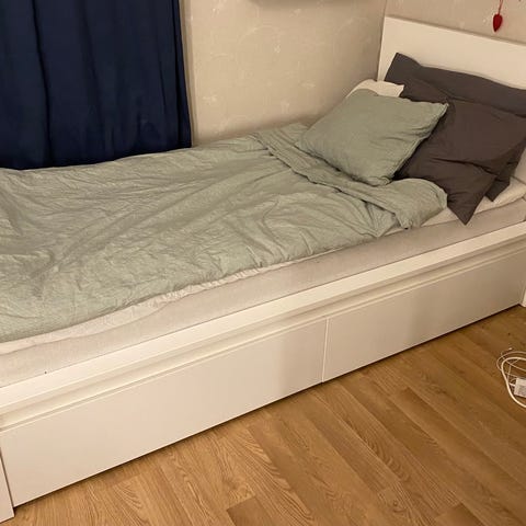 Hilding sängram i mörkblå färg med träben. Enkel design med bäddmadrass om så önskas.