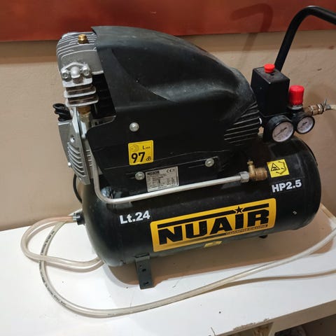 2-cylindrig, remdriven kompressor, där remskivan på kompressordelen har fläktvingar för bra kylning. Lågt varvtal. Kompressorn är utrustad med tryckströmbrytare, manometer, säkerhetsventil, reduceringsventil, snabbkoppling och hjul. 3-fas handske ingår ej.