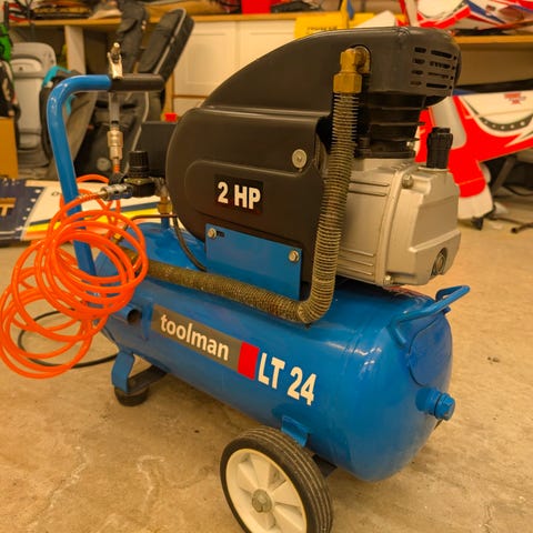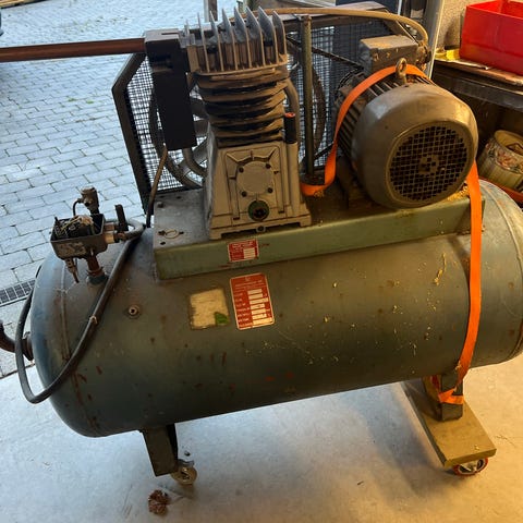 Oma HP 2,5 luftkompressor med en tankkapacitet på 24 liter. Kompressorn är röd och utrustad med tryckmätare och regulator. Modell OC2-6-24 CM 25, tillverkad 2004.