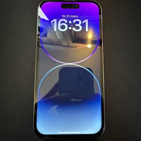 Apple iPhone 14 Pro mobiltelefon med 128 GB lagringskapacitet. Telefonen har en skärm med hög upplösning och flera kameror på baksidan. Enheten är i färgen mörklila och levereras med originalförpackning.