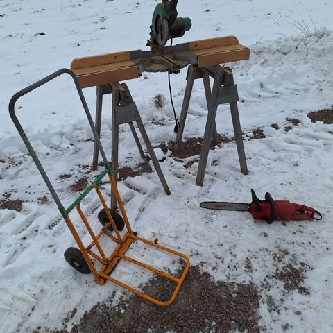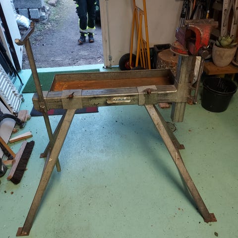 Sågbock med fäste för motorsåg . Är rejält byggd stabil och ihoppfällbar för enkel transport . Säljes billigt vid smidig affär skickas Inte.
