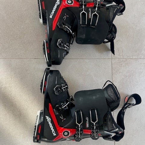Pjäxorna har fyra spännen och är anpassade för alpinskidåkning.