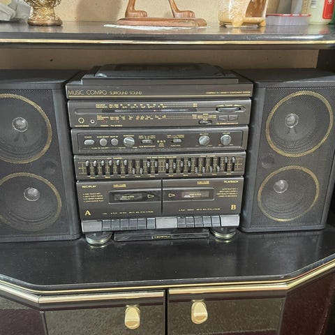 Manick säljes billigt pga fin men behöver pysslas om. Bandaren startar men behöver kollas och stjärnpanelen (som kan blinka i takt med musiken) behöver fästas. Formen är som en gammal bilradio men det finns inbyggda högtalare i sidorna och vanlig sladd så den kan användas helt fristående (om en monterar på en fjärde fot som saknas). Befintligt skick, så att säga!