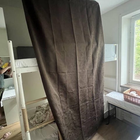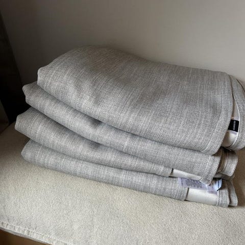 Gardinerna har kortats ner med snabbfållband och är ca 237 cm långa istället för 250. Ni kan se på de 2 sista bilderna hur det ser ut 😊