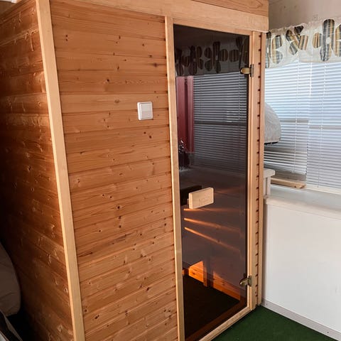 Bastuhus med vedeldad kamin, lounge med toalett och dusch