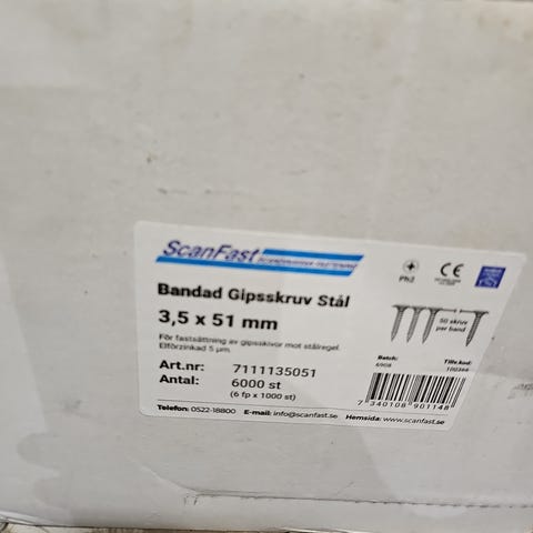 Gipsskruv för träregel 3,9x30. Mer än hälften kvar, se bild. Två rullar glasfiberremsa. Oöppnade förpackningar glasfiberremsor 50mm x 20m